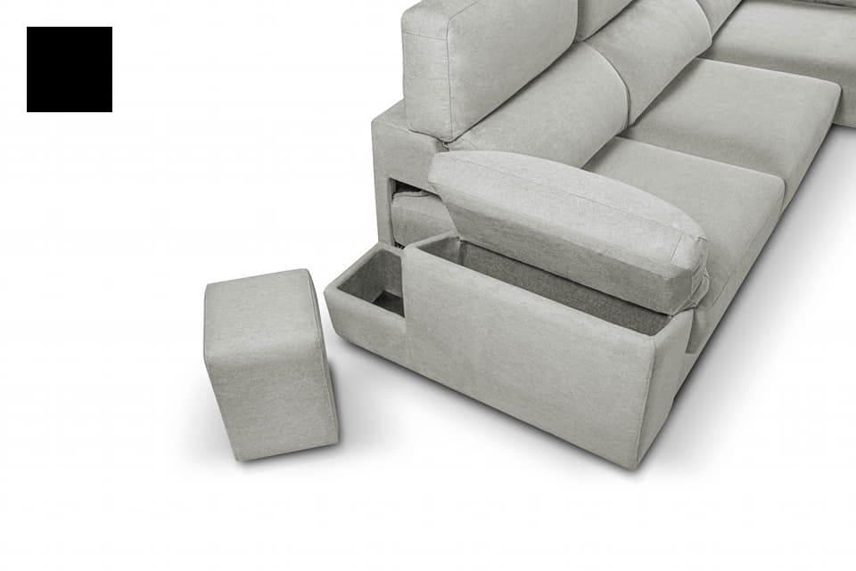 Brazo sofá con arcón, almohada siesta con bisagras multiposición y pufs de serie, de 30 cm.